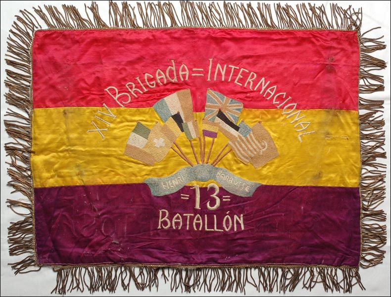 La guerre civile commence. La solidarité avec les républicains s'organise dans le monde entier. Des dizaines puis des centaines de volontaires passent les Pyrénées pour combattre les fascistes. Après la création des Brigades internationales par l'Internationale communiste, le 22 octobre 1936, des milliers d'hommes et de femmes leur emboîtent le pas. Le bataillon Henri Barbusse de la XIVème Brigade, dont voici le drapeau, était essentiellement composé de volontaires français.
