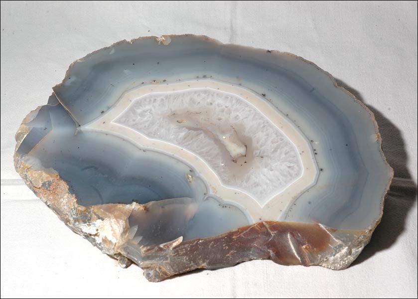 La lettre jointe précise : "Agate de Madagascar : variété de silice compacte (agrégat de fibres microscopiques). Les petites inclusions noires sont des dendrites d'oxyde de manganèse. La couleur est très probablement due à des traces de manganèse. Au centre, agrégat de cristaux de quartz hyalin".