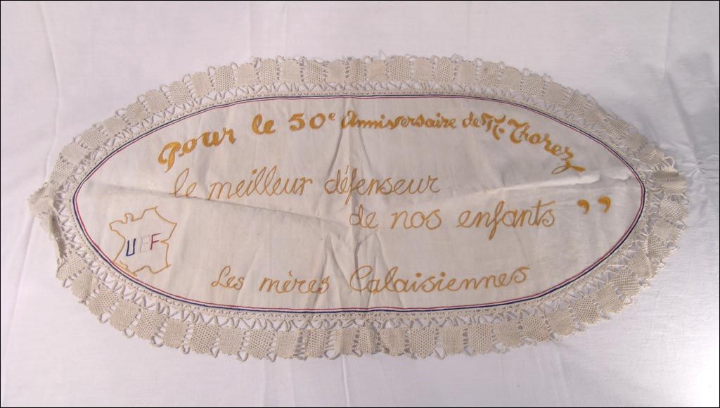 Napperon Ce napperon bordé de dentelle fut offert à Thorez par les mères calaisiennes. La dentelle de Calais fut pendant longtemps la première activité industrielle de la ville : la filière employait 30 000 personnes en 1914.