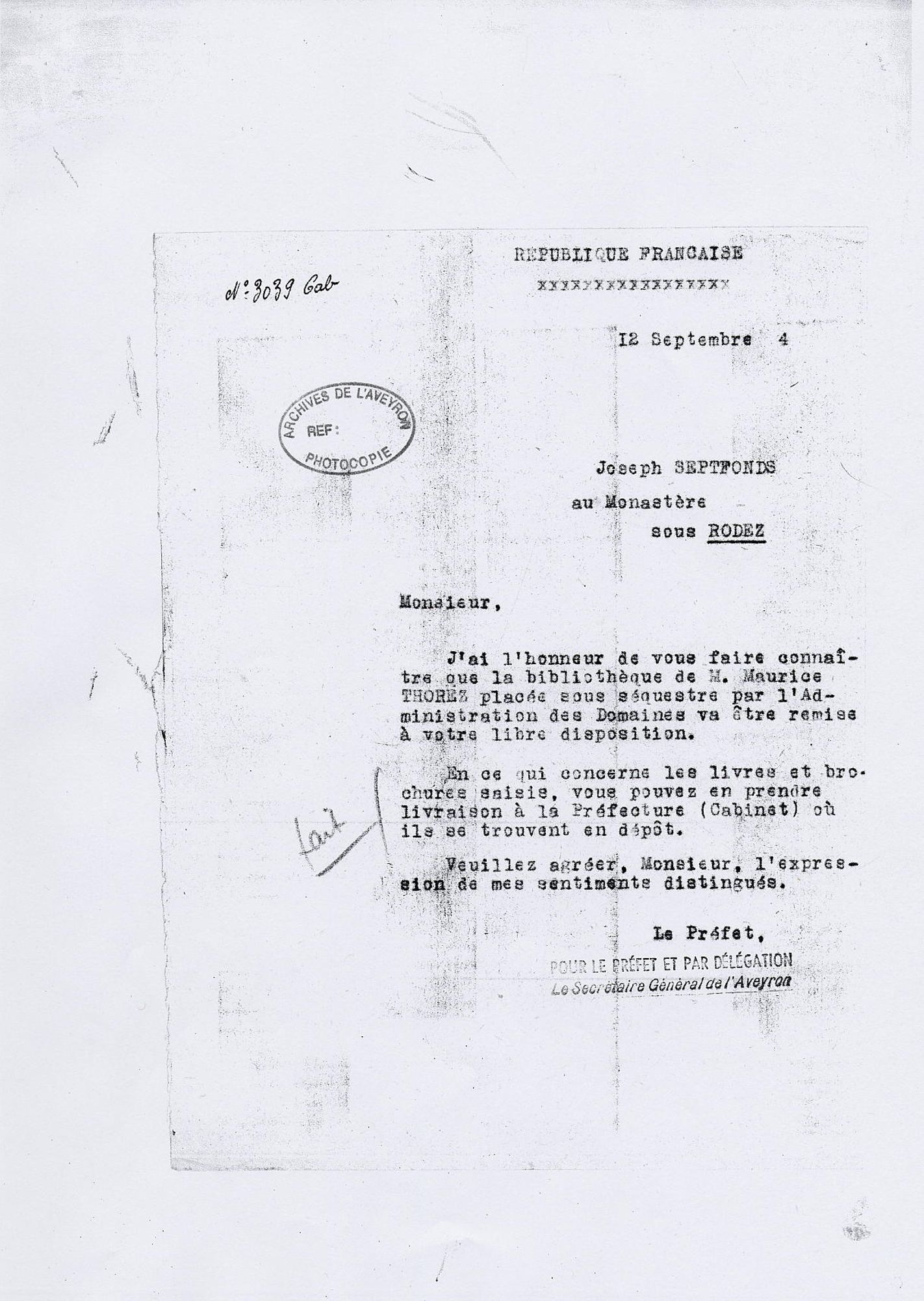 La ville de Rodez et sa région furent libérées le 18 août 1944. Peu après, Jeanne et Joseph Septfonds étaient avisés de la levée du séquestre et de la remise à leur libre disposition des livres saisis. Le séquestre prit officiellement fin le 28 septembre, deux mois avant que Maurice Thorez ne rentre d’URSS en France libérée.