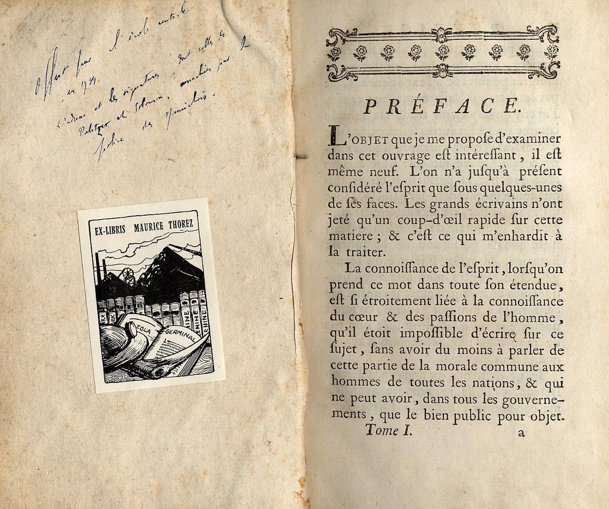 Par ailleurs, c’est peut-être dans ces années d’immédiat après-guerre, au gré des "prises de guerre" et de l’épuration, que Maurice Thorez entra en possession d’un certain nombre d’ouvrages ayant appartenu à Charles Lesca. Charles Lesca était un riche héritier d’origine argentine, profondément antisémite et antirépublicain, devenu l’un des principaux actionnaires du journal Je suis partout, à la faveur de la vente du quotidien par la librairie Fayard, en 1936. Il devint l’administrateur du journal puis, en 1943, son directeur. À la Libération, Charles Lesca s’exila en Amérique du Sud.