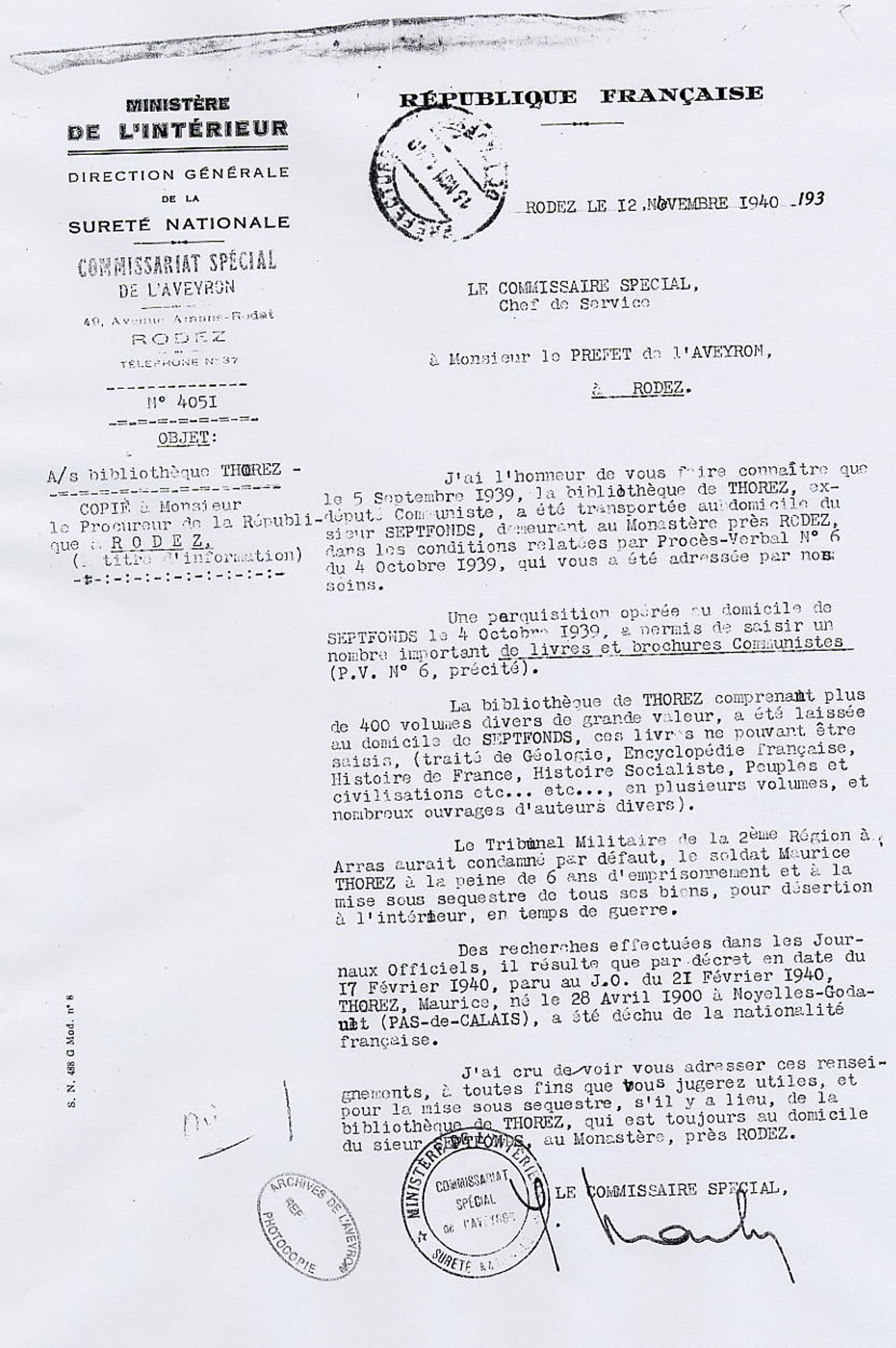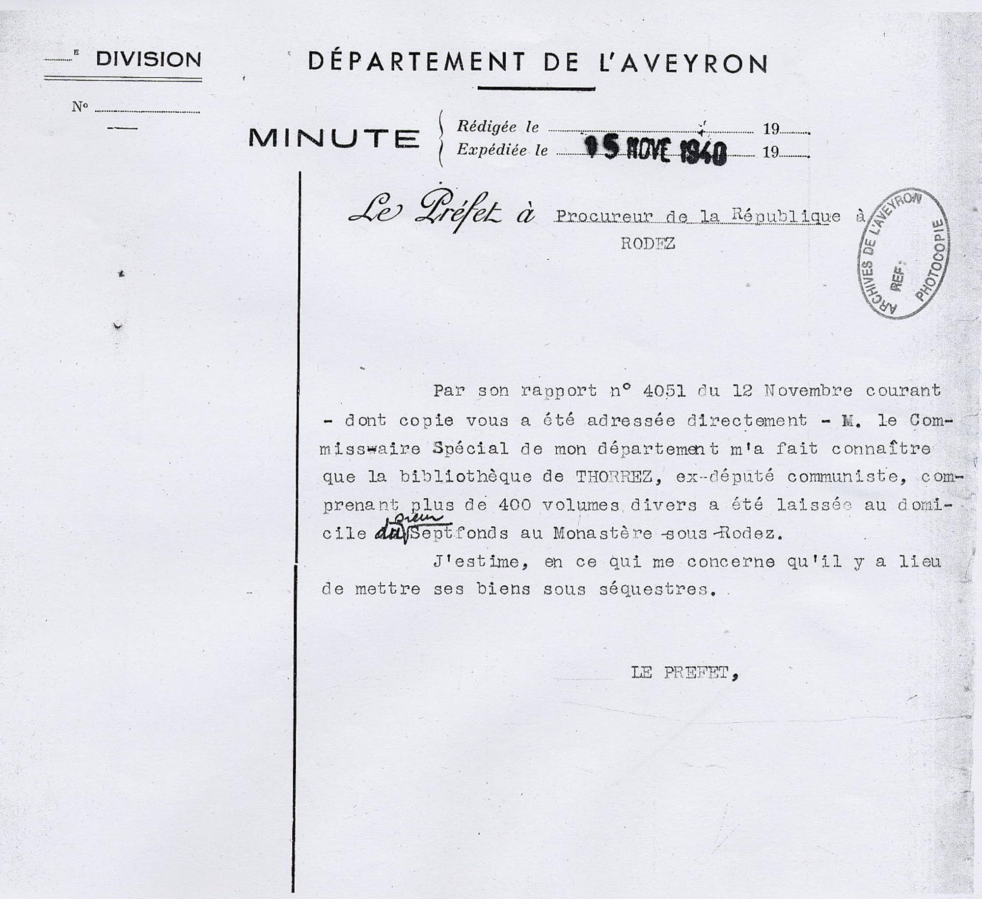 En conséquence, les livres de Thorez subsistant chez les Septfonds – ceux qui, n’ayant pas trait au communisme, n’avaient pas été saisis – furent placés sous séquestre, par ordonnance rendue le 23 décembre 1940 par le Président du Tribunal civil de Rodez. Conformément aux dispositions légales, l’Administration des Enregistrements et Domaines, représentée par son directeur pour le département de la Seine, fut nommée administrateur-séquestre de ces biens.