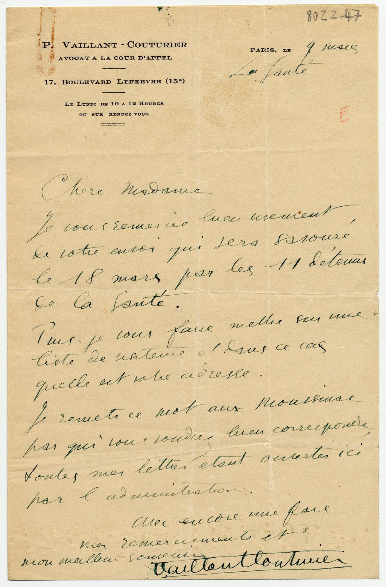 Thorez était l'un des 11 détenus que Vaillant-Couturier évoque dans cette lettre. Cette lettre fut offerte à Maurice Thorez, à l'occasion de son 50ème anniversaire, par Robert Brécy.