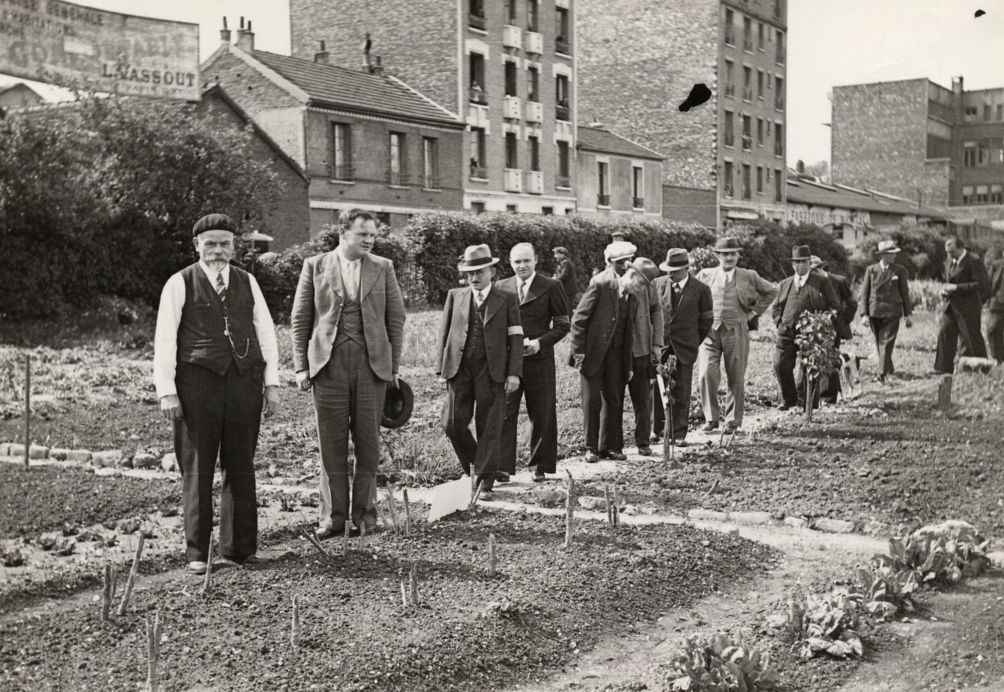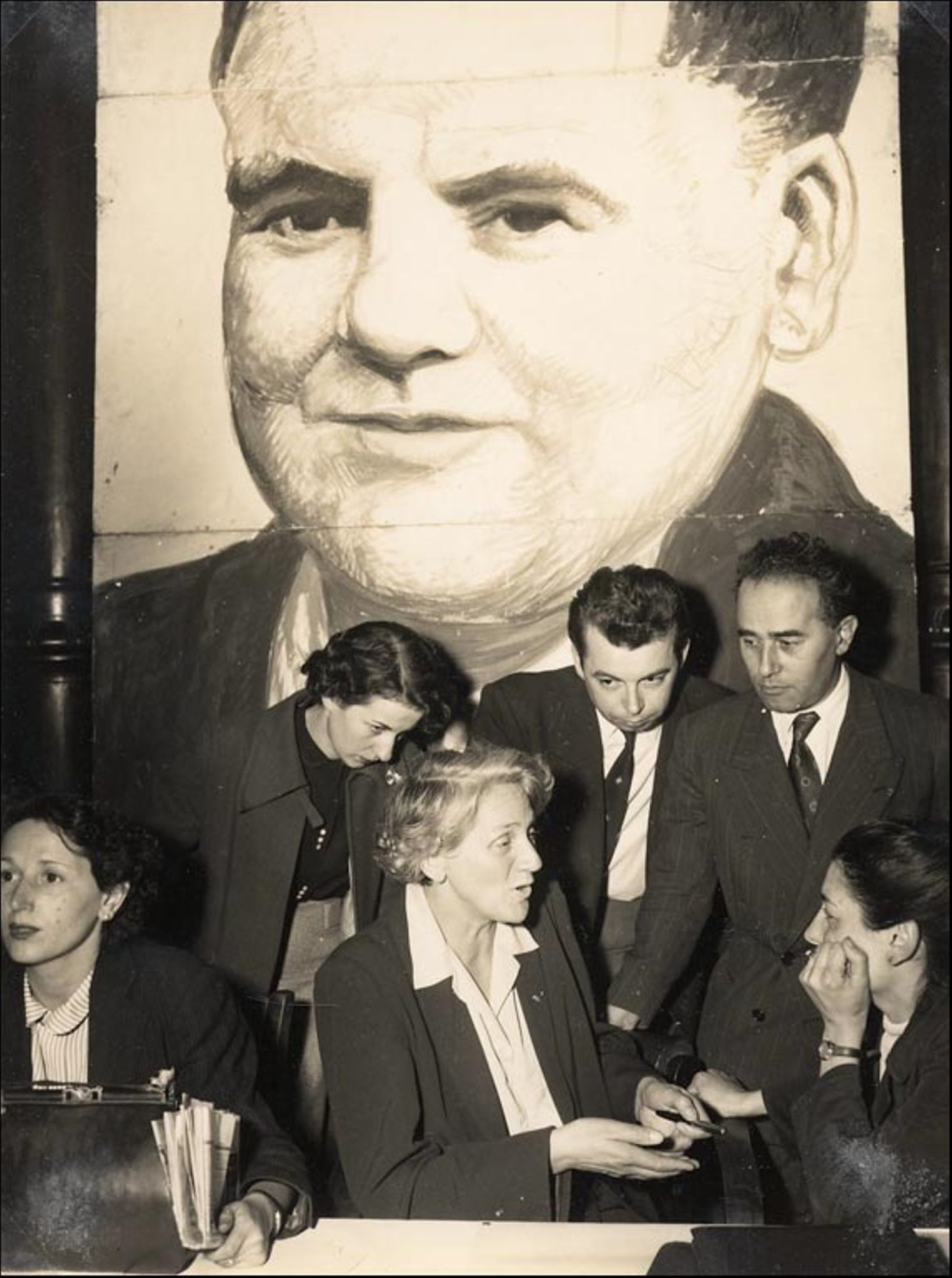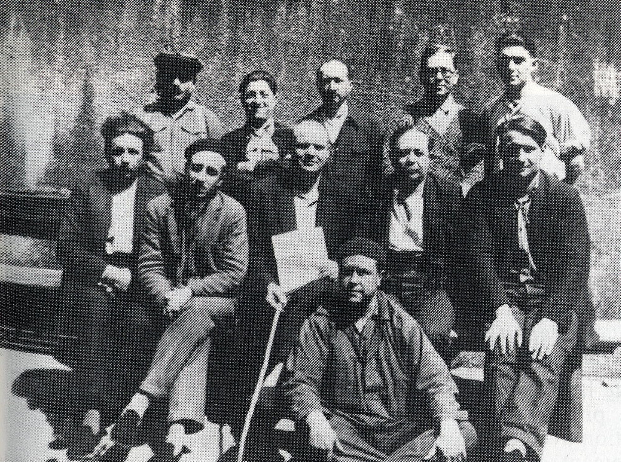 Thorez est assis au centre, entouré de Gabriel Péri et d'André Marty. Paul Vaillant-Couturier est assis sur le sol.