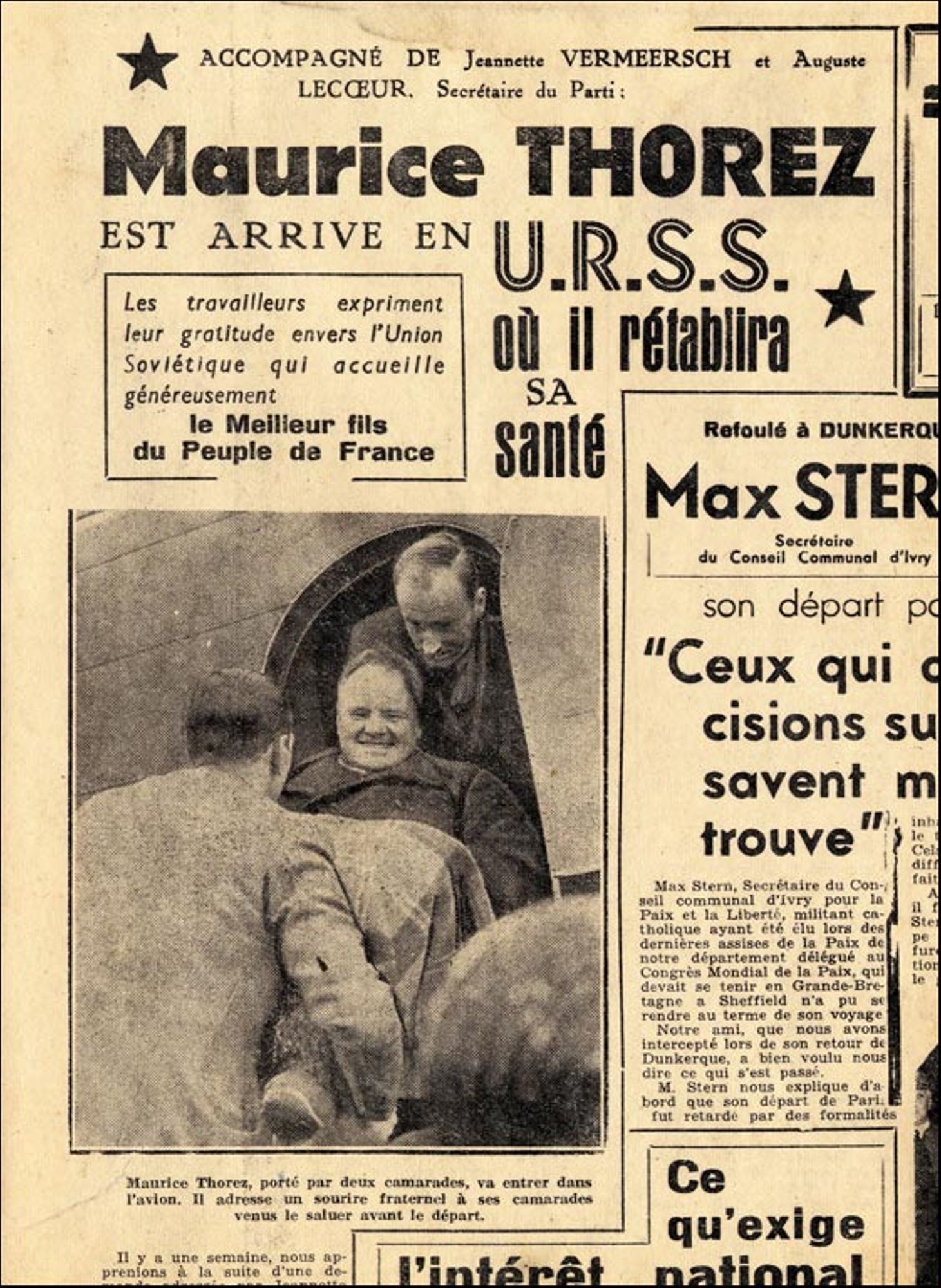 C’est dans l’exercice d’une pleine autorité sur le Parti que Maurice Thorez est frappé, le 10 octobre 1950, par une attaque d’hémiplégie. Physiquement éprouvé, le Secrétaire général part le 12 novembre pour l’Union soviétique, pour y recevoir des soins. Il y demeurera trois ans, régulièrement informé des affaires internes du Parti dont la direction par intérim est assurée par Jacques Duclos.