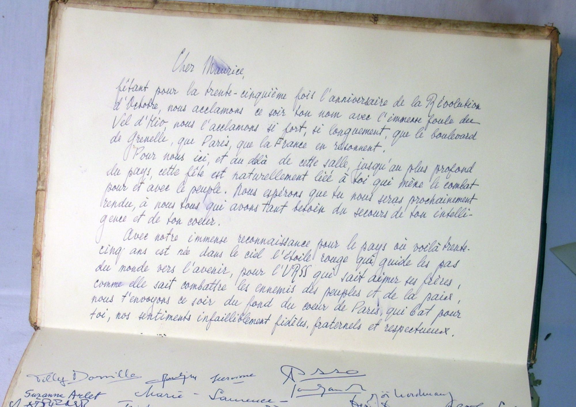 Pendant le rassemblement au Vel d'Hiv', Jacques Duclos fit acclamer le nom de Thorez. Présenté à cette occasion, ce livre ancien dédicacé fut ensuite expédié à Thorez.