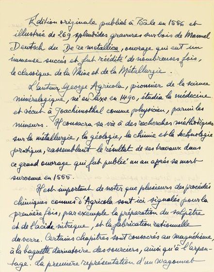 L'auteur, Georges Agricola, pionnier de la science minéralogique, né en Saxe en 1490, étudia la médecine et vécut à Joachimsthal comme physicien, parmi les mineurs. Il consacra sa vie à des recherches méthodiques sur la métallurgie, la géologie, la chimie et la technologie pratique, rassemblant le résultat de ses travaux dans ce grand ouvrage qui fut publié un an après sa mort survenu en 1555.