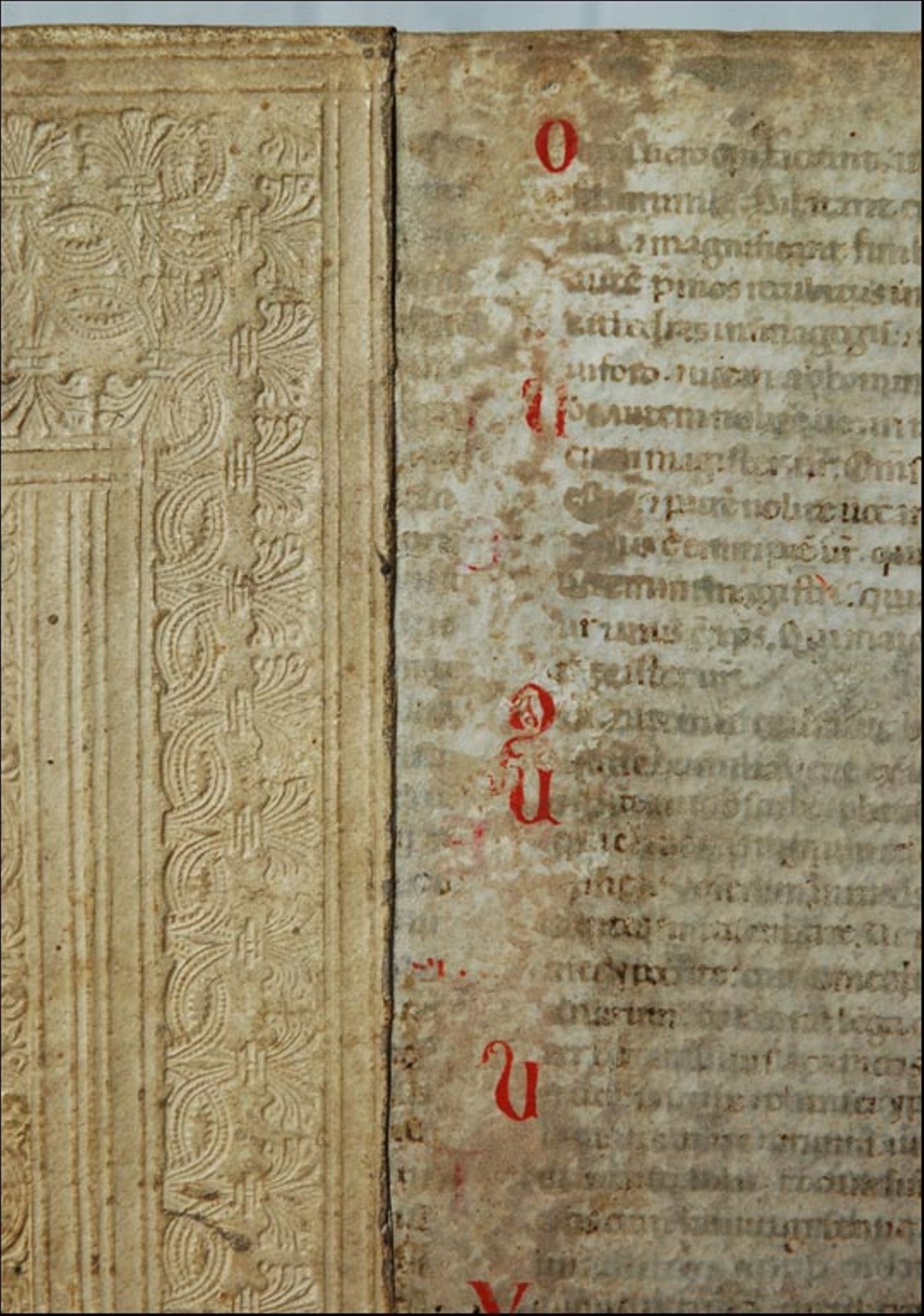 Le dos du livre, en daim blanc avec deux étiquettes dorées