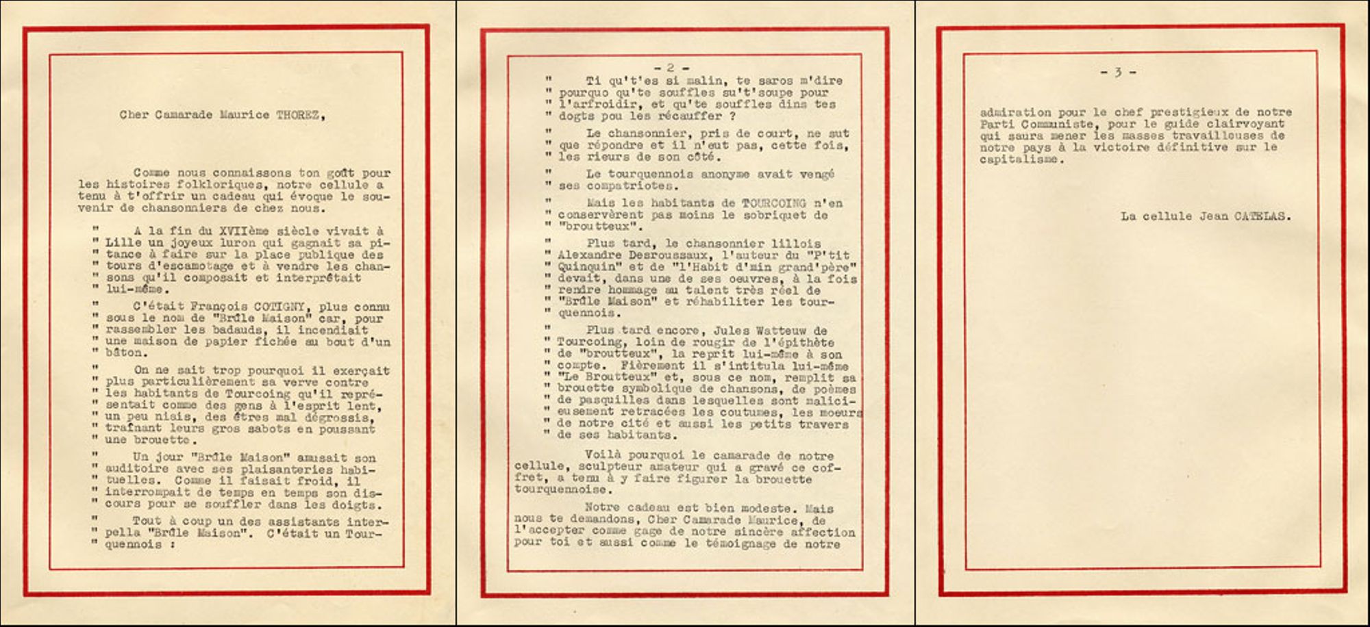 Depuis 1945, l’implantation électorale du Parti communiste français s’était homogénéisée sur le territoire, et un journal de cellule pouvait annoncer qu’à la mairie d’Ivry étaient présentés, « dans un cadre artistique et instructif, les cadeaux, vœux ou messages adressés par les simples gens de toutes les régions de France ». Cette composante régionale n’était pas non plus étrangère à la personnalité de Thorez, qui, de l’avis de ses proches, manifestait pour son pays un attachement érudit et communicatif. En pleine guerre froide, l’exposition du 50ème anniversaire s’employait à démontrer que le PCF était un parti national, en dépit des accusations.