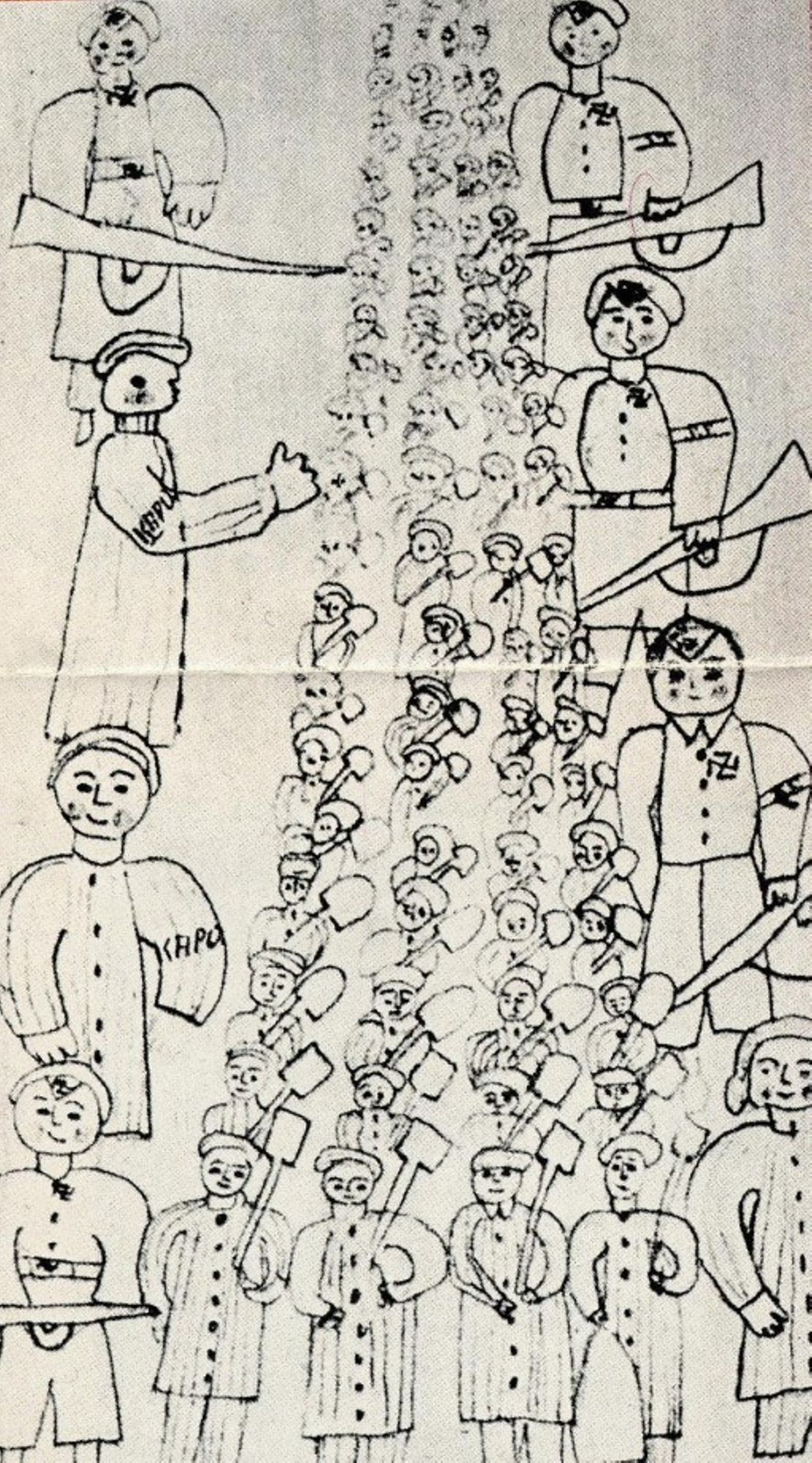 Lucien Artous raconte : « Attelés comme des bêtes, nous tirions notre chargement, en marchent péniblement le long des traverses, sous la menace des coups de fouet que nos gardiens distribuaient au hasard. »