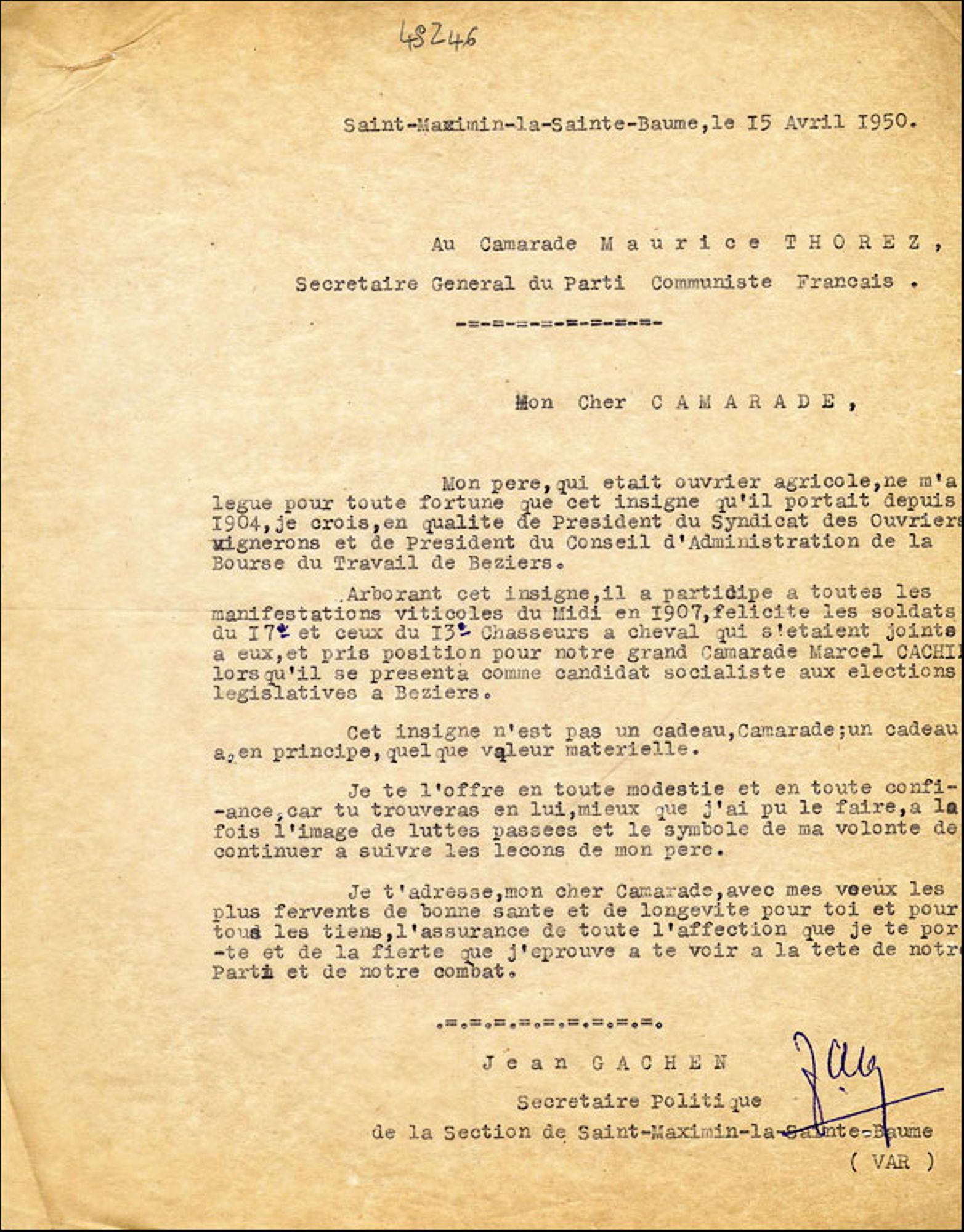 La Révolution française, la Commune de Paris, le Front populaire, la Guerre d’Espagne et la Résistance sont au cœur de la mémoire ouvrière. En hommage à Thorez, des militants lui adressèrent des documents originaux issus de la Révolution Française et de la Commune de Paris : assignats et gravures révolutionnaires, lettres du général Kléber, procès-verbaux de la Convention, albums illustrés de la Commune de Paris… autant de cadeaux qui faisaient du député l’héritier de Robespierre et des communards. Lors du 50ème anniversaire de Thorez, la Guerre d’Espagne et la Seconde Guerre mondiale étaient encore vives dans les esprits. De nombreux cadeaux faisaient écho à ces événements. Objets de mémoire plus que d’histoire, la plupart de ces cadeaux n’entretiennent pas le souvenir de personnages ou de faits d’armes illustres : ils retracent des trajectoires individuelles, racontent des familles exposées au drame. Aussi trouve-t-on, parmi ces cadeaux, de nombreux effets personnels. Lettres, médailles, souvenirs de prison, poupée, bijou, gobelet… Certains de ces objets constituaient, pour leurs expéditeurs, le souvenir unique d’un proche disparu, sur le front espagnol, ou dans les camps nazis.