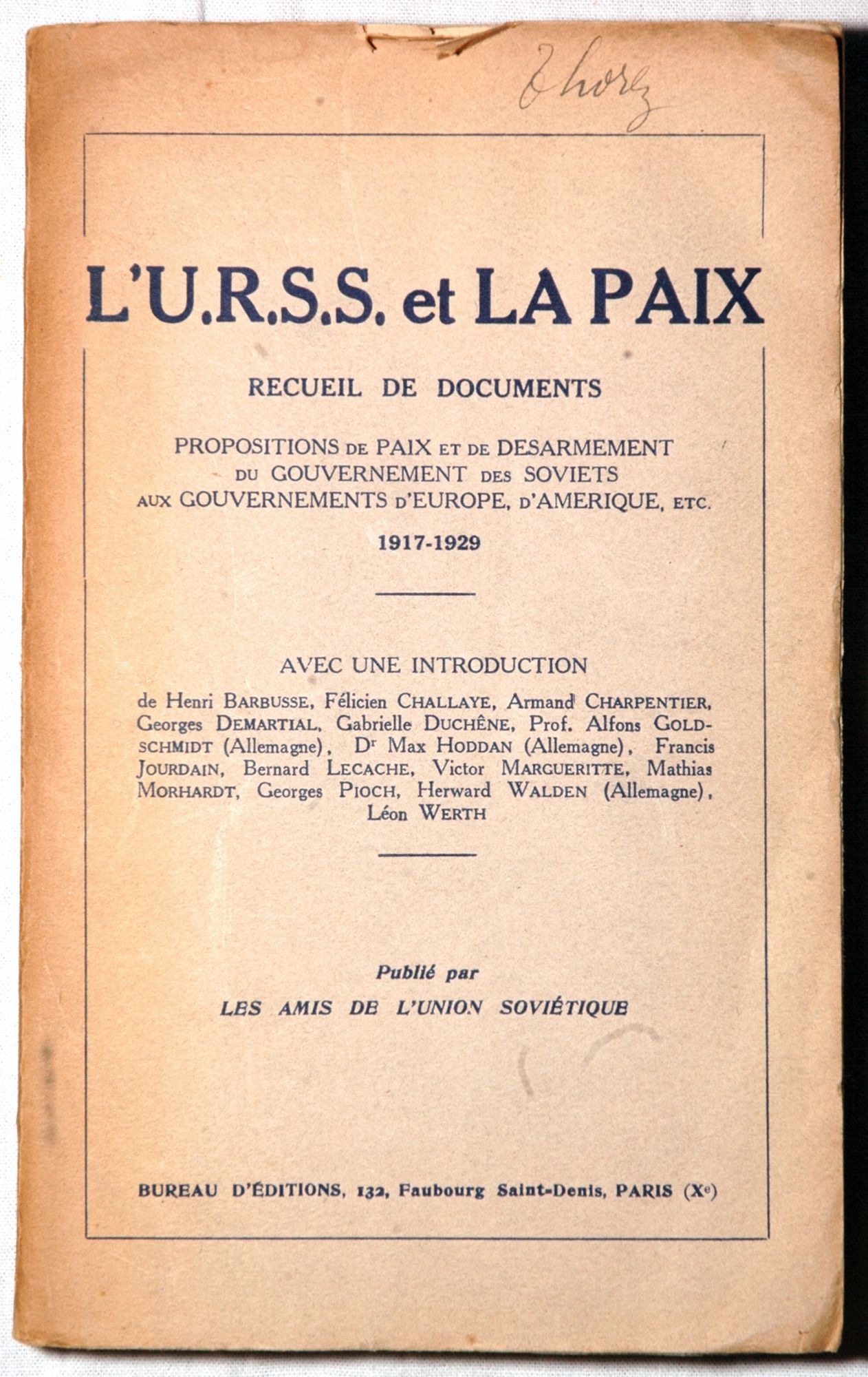 L'URSS et la paix, Bureau d'éditions, Paris, s.d., 80 Z 1-7600. Thorez était en possession de ce livre à la prison Charles III de Nancy.