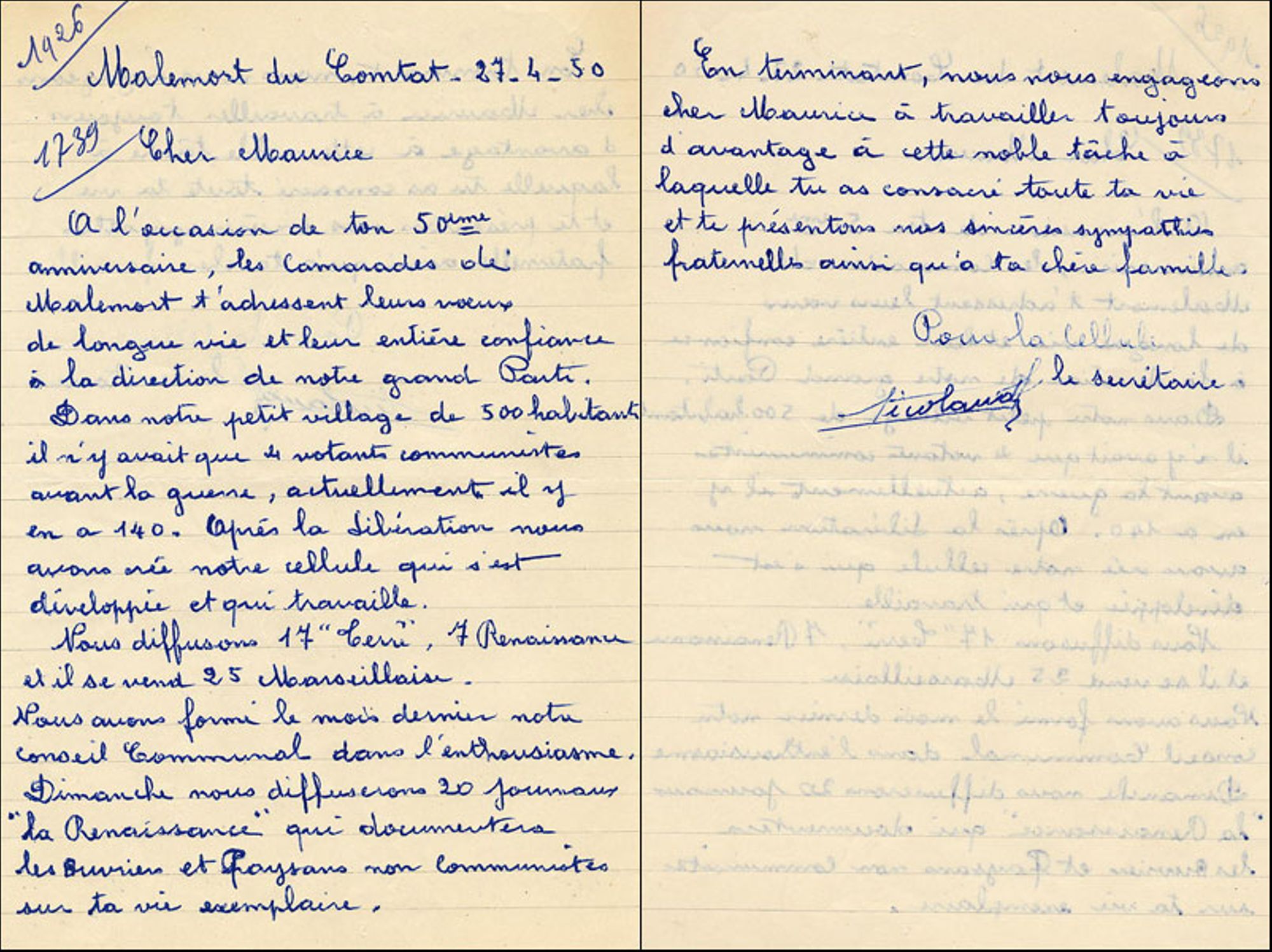 Recueils de lettres, livres d’or, albums de photographies : cellules et sections communistes étaient à l’origine de collectes qu’elles étendaient le plus souvent à leur usine ou à leur quartier. Le 50ème anniversaire était d’ailleurs l’occasion d’inciter les sympathisants à franchir le pas de l’adhésion : une campagne d’adhésion fut engagée, dont les résultats chiffrés étaient transmis par les cellules à Thorez, en guise d’hommage pour ses cinquante ans.