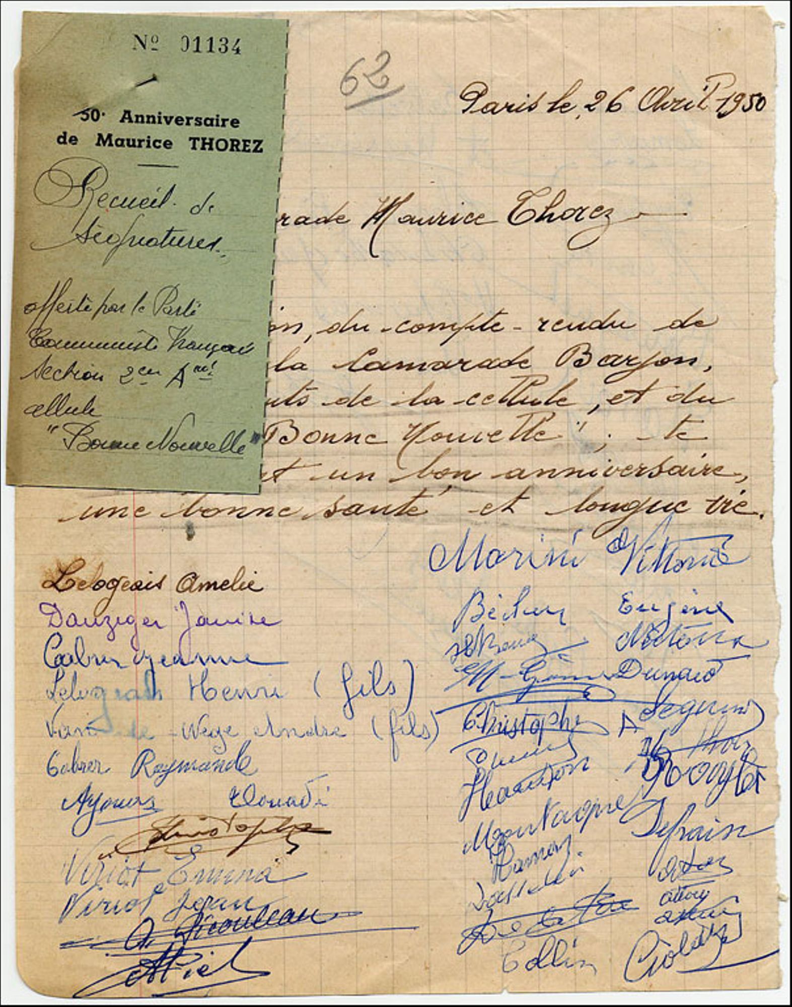 Le gros livre d’or, dans lequel les visiteurs de l’exposition d’Ivry laissèrent leur signature, offre quant à lui un instantané du mouvement communiste en 1950.